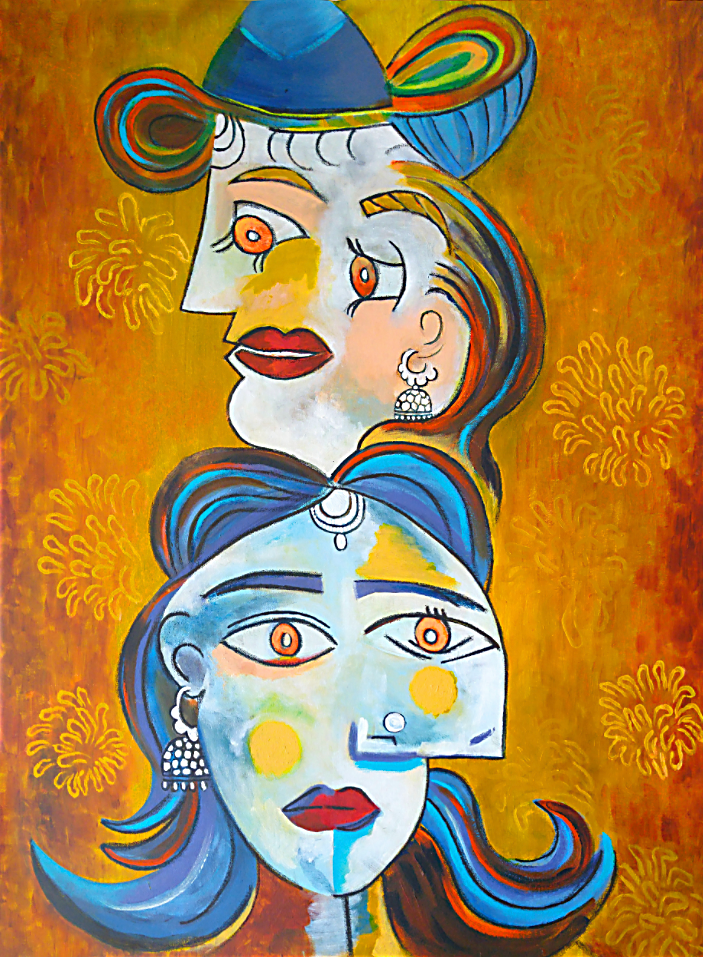 This life-size painting is part of a series inspired by Picasso, viewed through the eyes of a modern woman who is deeply connected to her ethnic values. The artwork features vibrant colors and abstract geometric shapes, blending modernity with tradition. The woman depicted is adorned with accessories that symbolize her cultural heritage, yet she blooms within these boundaries, showcasing a harmonious fusion of contemporary and ethnic influences.